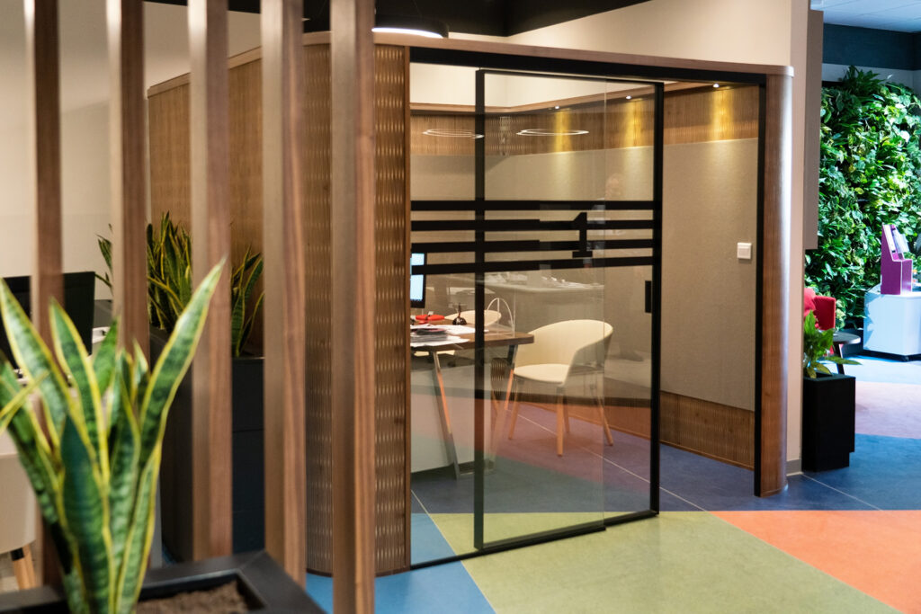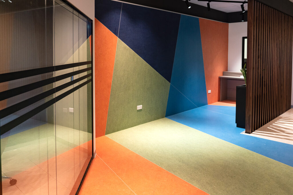 Lastly, an intricate pattern of linoleum wall and flooring was created to achieve the right balance between a vibrant and executive look and ensuring optimum conditions for the upkeeping of the branch.