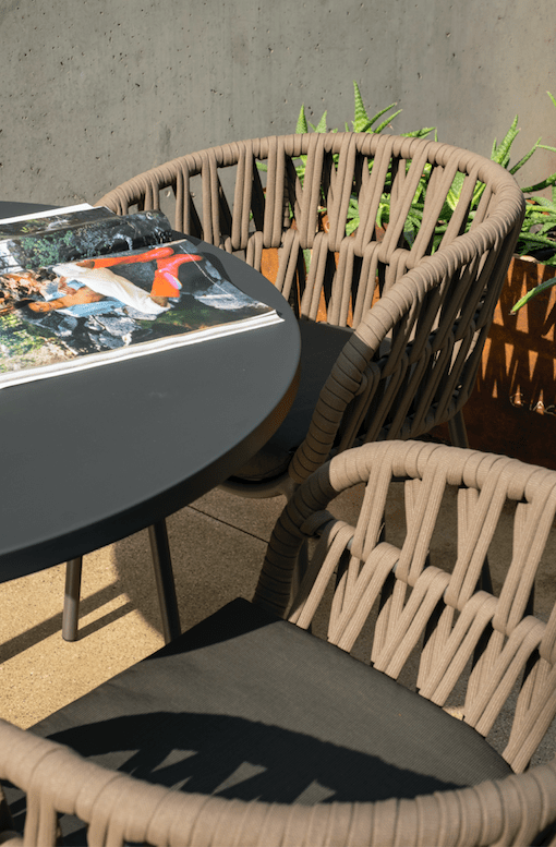 Armchair in aluminum painted in taupè. Textilene cord. Cushion in fabric.