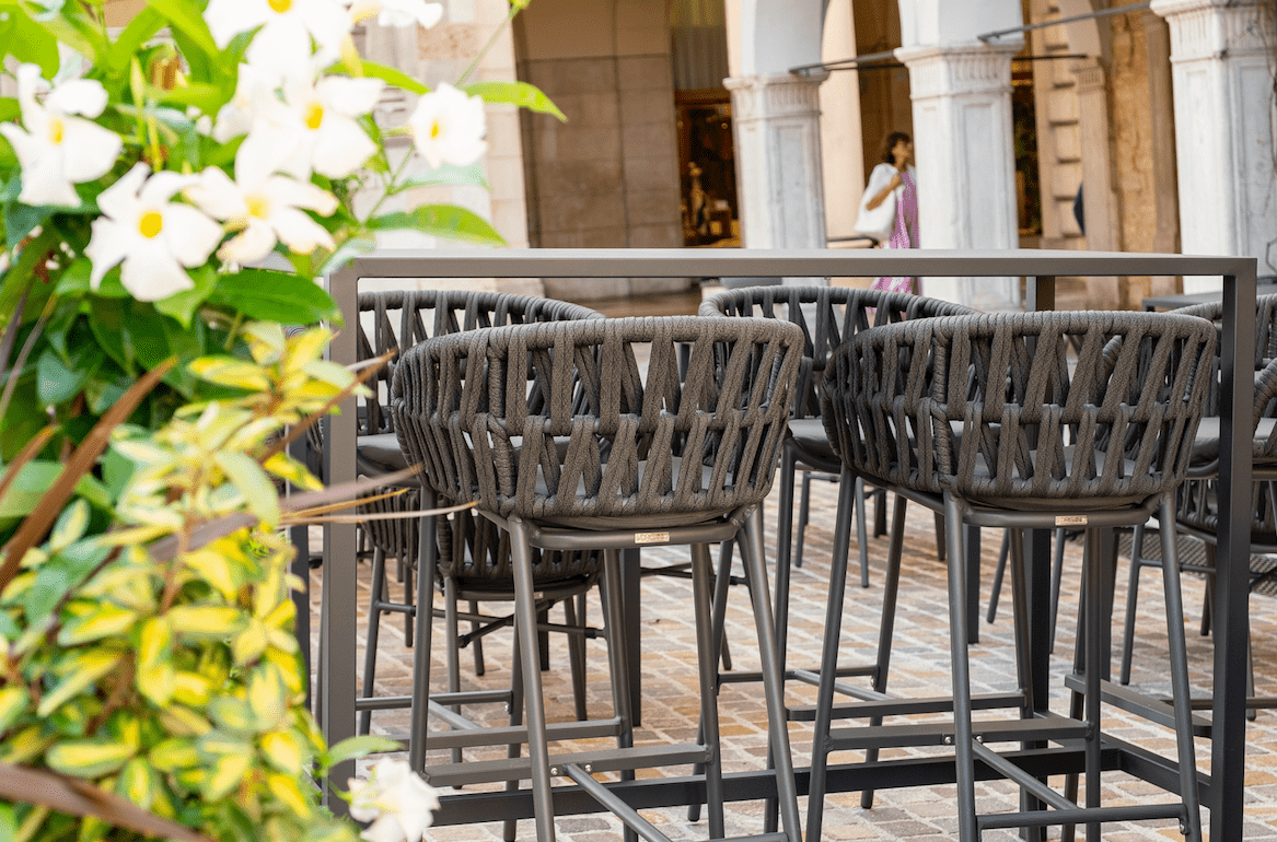 Armchair in painted aluminum. Textilene rope. Fabric cushion.
