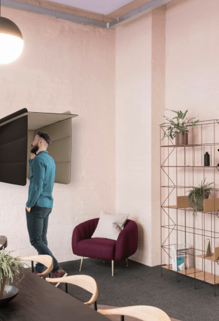 ECObooth is a space of privacy, defined by thermoformed sound-absorbing panels.