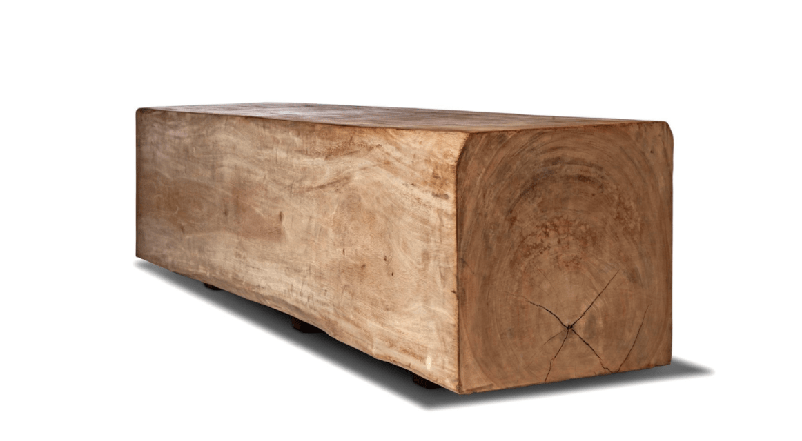 Bench The Suar log bench enhances the thickness of solid wood, being obtained from a natural squared wood log of 45 cm side and 2 meters long. The Suar wood log bench consists of a seat resting on 3 removable feet that keep it raised from the ground and make it easier to move.